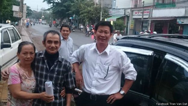 Luật sư Trần Văn Đạt (áo trắng) trong ngày đón ông Nén tại ngoại