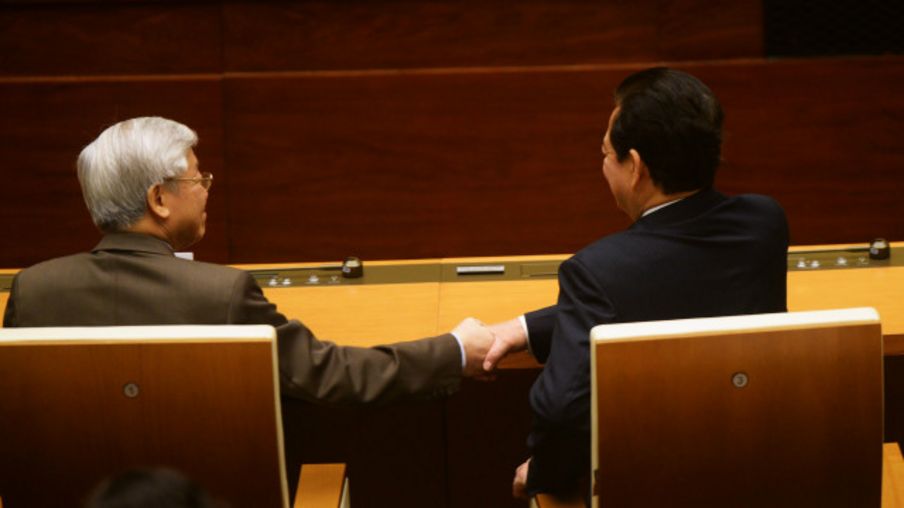 Tổng bí thư Nguyễn Phú Trọng bắt tay ông Nguyễn Tấn Dũng tại buổi bế mạc họp Quốc hội ngày 12/4