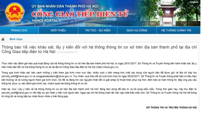 Trang mạng chính thức của thành phố Hà Nội dành cho người dân bình chọn về sự tồn tại của loa phường hiện không truy cập được do phải bảo trì sau khi có dấu hiệu tăng bất thường, sở Thông tin và Truyền thông Hà Nội thông báo hôm 07/02.